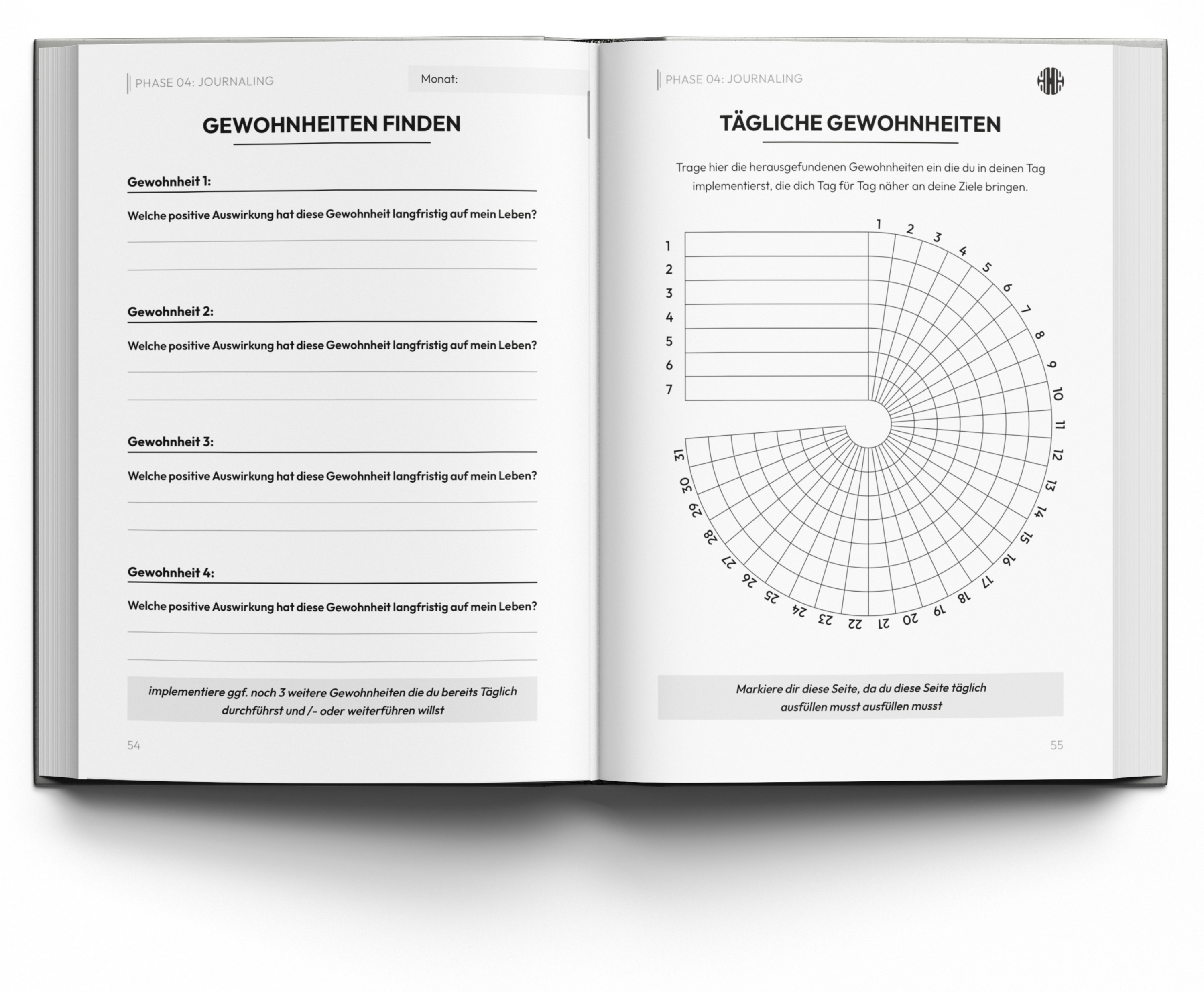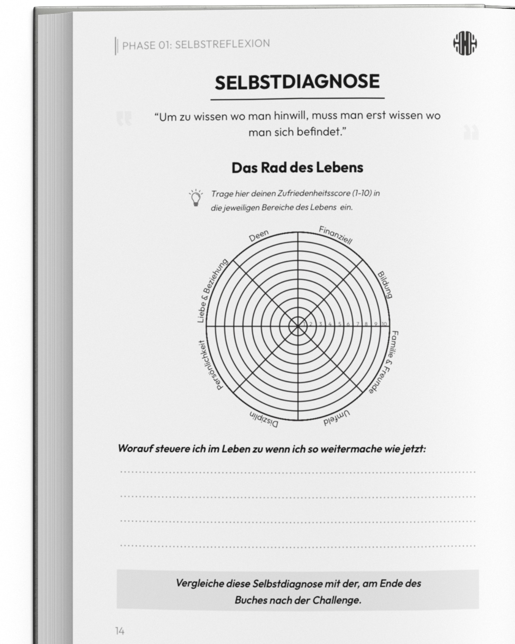 Was blockiert dich? Warum schiebst du auf? Durch gezielte Reflexionsfragen, das Lebensrad und tägliche Stimmungs-Tracker wirst du ehrlich – mit dir selbst und deiner Situation. Diese Phase zeigt dir schwarz auf weiß, wo du gerade stehst und was dich zurückhält.